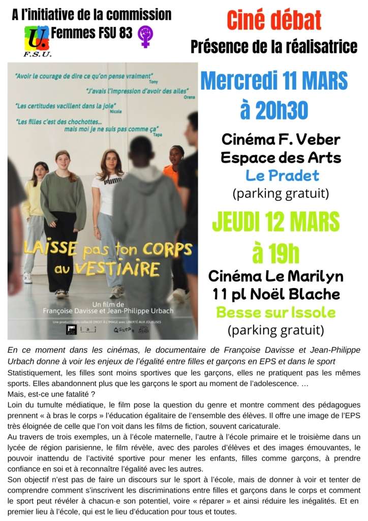 Ciné débat : Laisse pas ton corps au vestiaire 2026-02-11T17:52:11+01:0011 février 2026|Catégories : À LA UNE| Partagez cet article ! FacebookXWhatsAppTelegramEmail Articles similaires Autour du 8 mars et de l’égalité femme-homme Autour du 8 mars et de l’égalité femme-homme 11 février 2026 PIONNIÈRES : un jeu de société pour l’égalité femme-homme le 3 mars 2026 à Toulon PIONNIÈRES : un jeu de société pour l’égalité femme-homme le 3 mars 2026 à Toulon 11 février 2026 Appel à la mobilisation des acteur.trices de l’éducation Face aux appétits de l’extrême droite, résister et renforcer l’école publique ! Appel à la mobilisation des acteur.trices de l’éducation Face aux appétits de l’extrême droite, résister et renforcer l’école publique ! 6 février 2026 Commission femmes : soirée débat avec Sigrid Gérardin le 3 février 2026 Commission femmes : soirée débat avec Sigrid Gérardin le 3 février 2026 26 janvier 2026 Jacques SEDES nous a quitté-es Jacques SEDES nous a quitté-es 24 janvier 2026