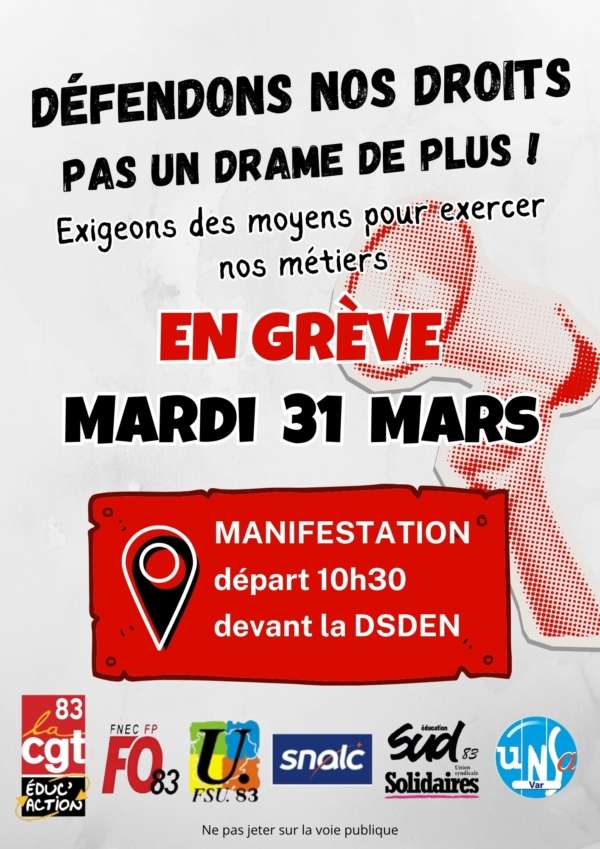 L’Éducation nationale dans la rue le 31 mars 2026 2026-04-02T13:44:19+02:002 avril 2026|Catégories : À LA UNE| Mardi 31 mars, les personnels de l’Éducation nationale ont défilé à Toulon pour dénoncer leurs conditions de travail et leur abandon par leur ministère. Partagez cet article ! FacebookXWhatsAppTelegramEmail Articles similaires Stage syndical académique « conditions de travail » – 7 Mai 2026 Stage syndical académique « conditions de travail » – 7 Mai 2026 2 avril 2026 COMPTE RENDU DE LA FORMATION SPÉCIALISÉE SANTÉ SÉCURITÉ ET CONDITIONS DE TRAVAIL ACADÉMIQUE (F3SCT A) DU 16 MARS 2026 COMPTE RENDU DE LA FORMATION SPÉCIALISÉE SANTÉ SÉCURITÉ ET CONDITIONS DE TRAVAIL ACADÉMIQUE (F3SCT A) DU 16 MARS 2026 24 mars 2026 Défendons nos droits : communiqué de l’intersyndicale de l’éducation dans le Var Défendons nos droits : communiqué de l’intersyndicale de l’éducation dans le Var 4 mars 2026 Contre le budget d’austérité, pour les droits des femmes ! Contre le budget d’austérité, pour les droits des femmes ! 3 mars 2026 Municipales : « Ne laissons pas l’extrême droite décider de l’avenir de nos territoires » Municipales : « Ne laissons pas l’extrême droite décider de l’avenir de nos territoires » 1 mars 2026